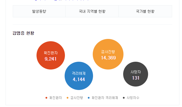 3월도 빠르게 지나가면서 3월 26일 기준으로 코로나 현황에 대해 지금까지 확진자가 9241명이 발생했으며, 사망자가 131명에 이르고 있습니다. 초기대응에 실패하면서 천문학적인 경제적 손실이 이어지고 있는것이 사실입니다.