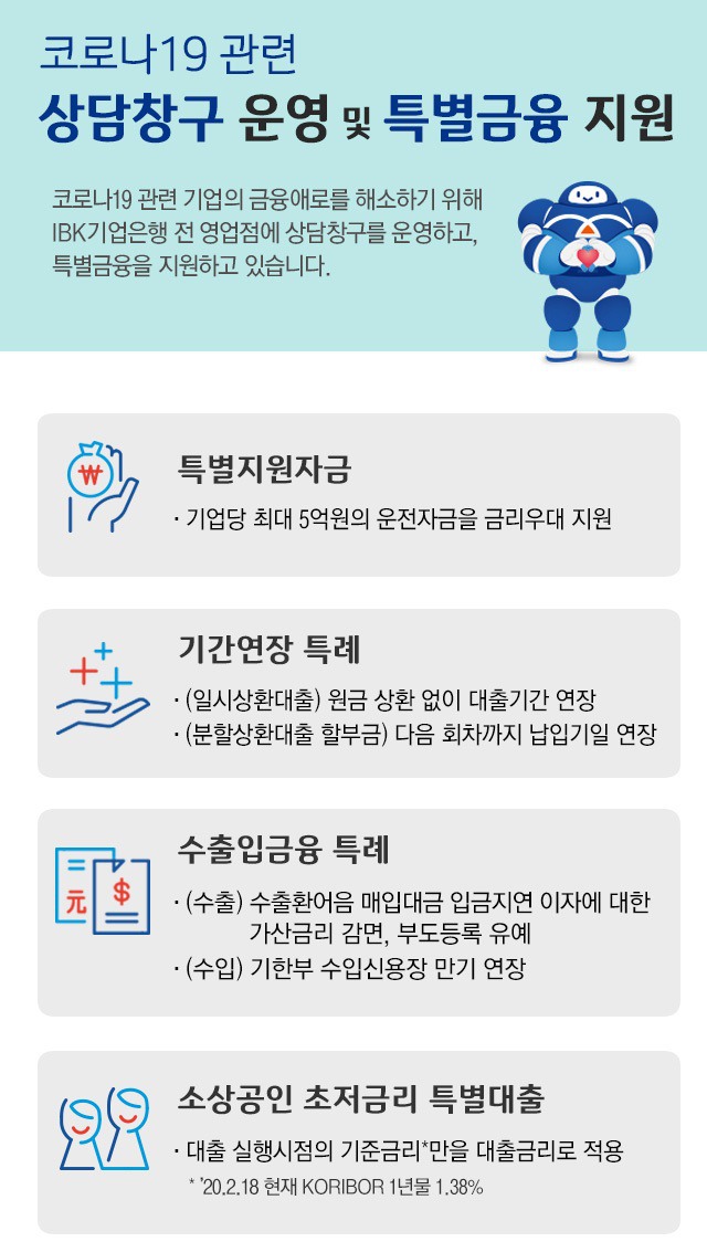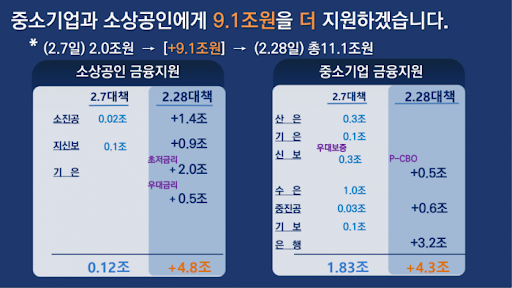 대출금리가 1.5% 수준인 초저금리 긴급 경영자금을 12조원 공급하고 8조원 규모의 보증 프로그램을 도입하는게 핵심입니다. 은행권에서 시행하는 만기연장과 이자상환 유예 조처를 4월 부터 저축은행이나 , 새마을금고 같은 제2금융권으로 전면 확대하는 내용도 포함되었습니다.